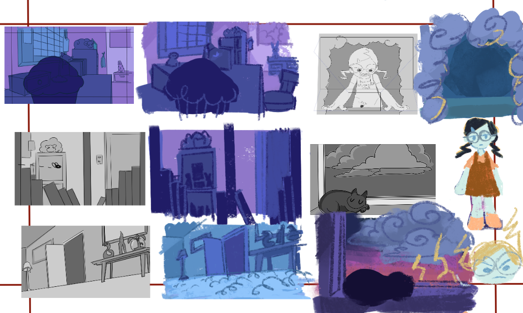 Attempted to design a girl who lived within the clouds, so experimented with a different colour palette and tried to depict lightning within her pig tails.