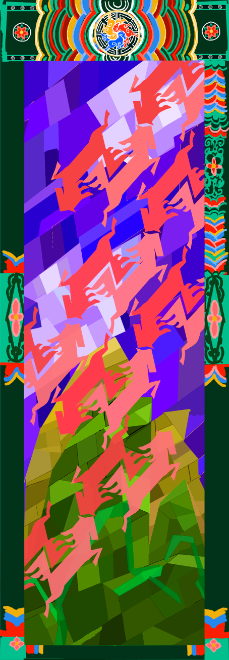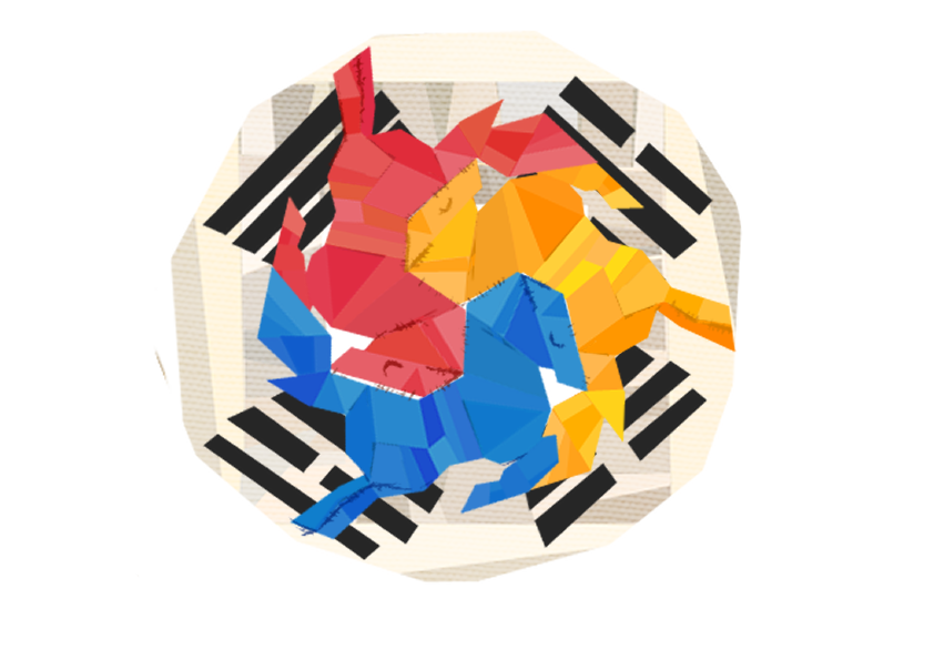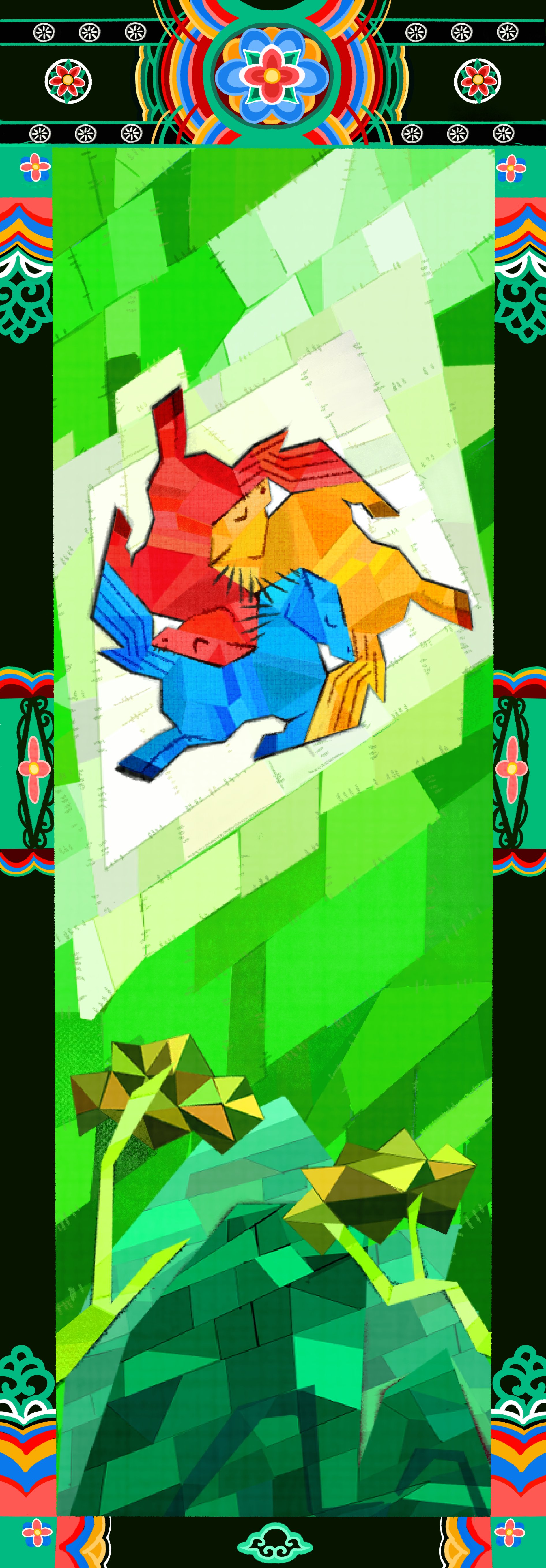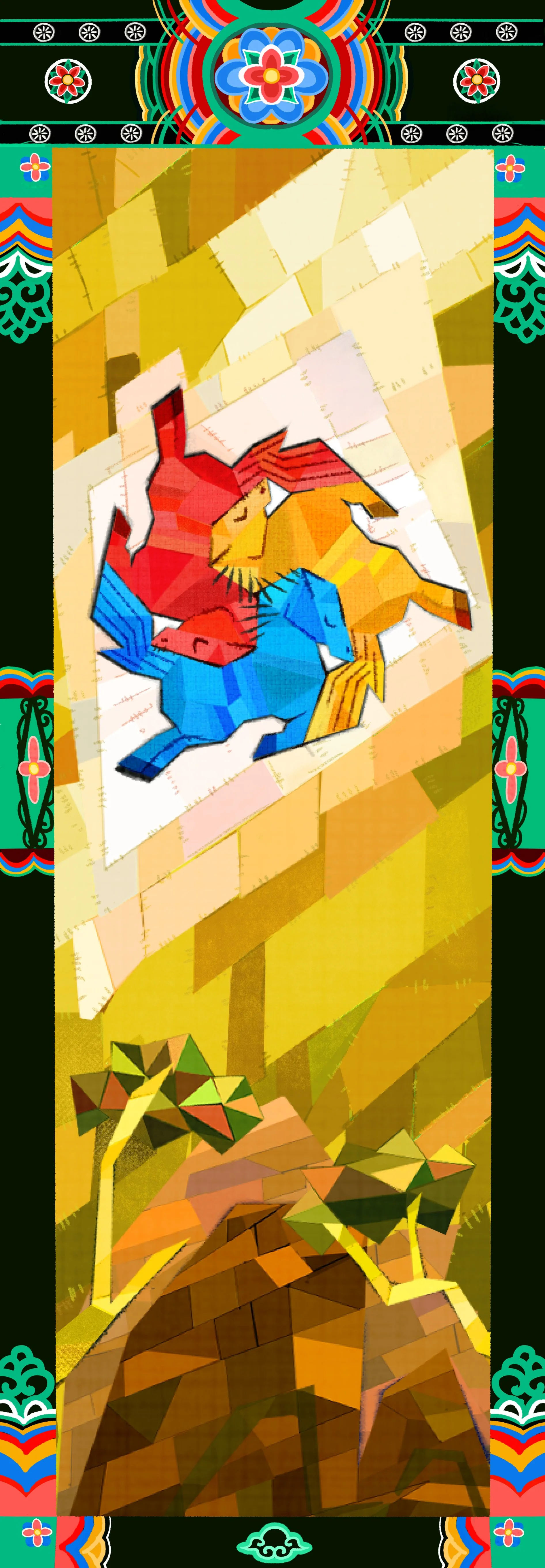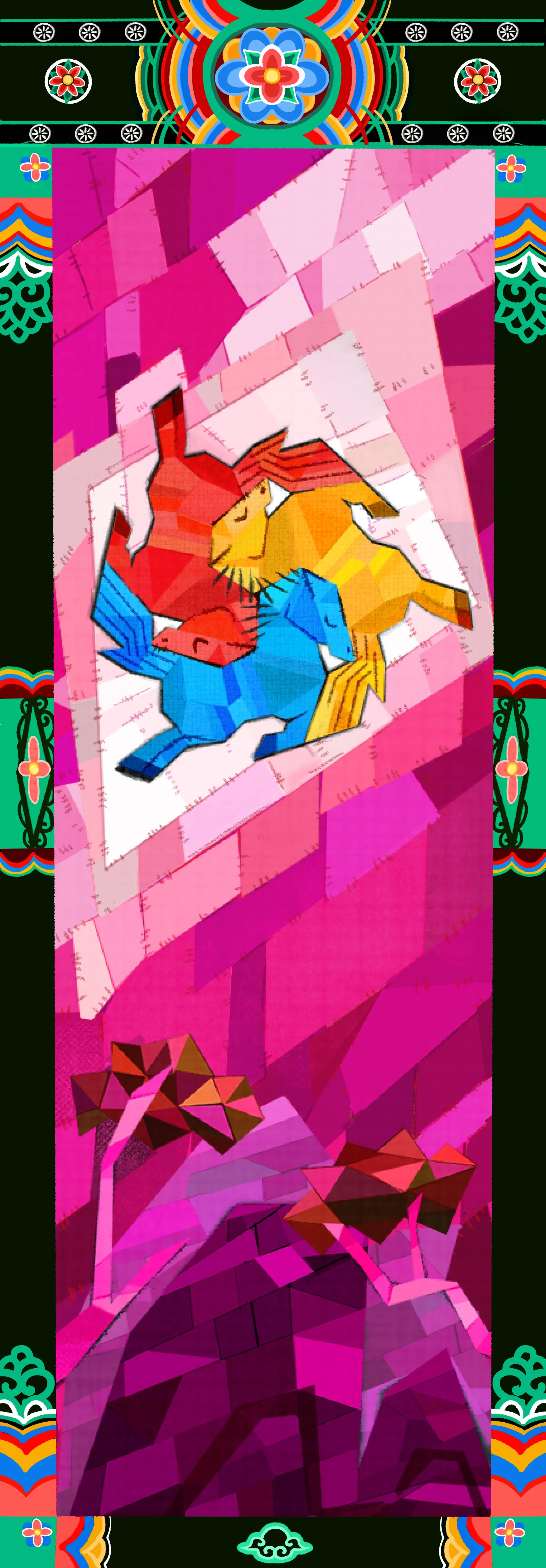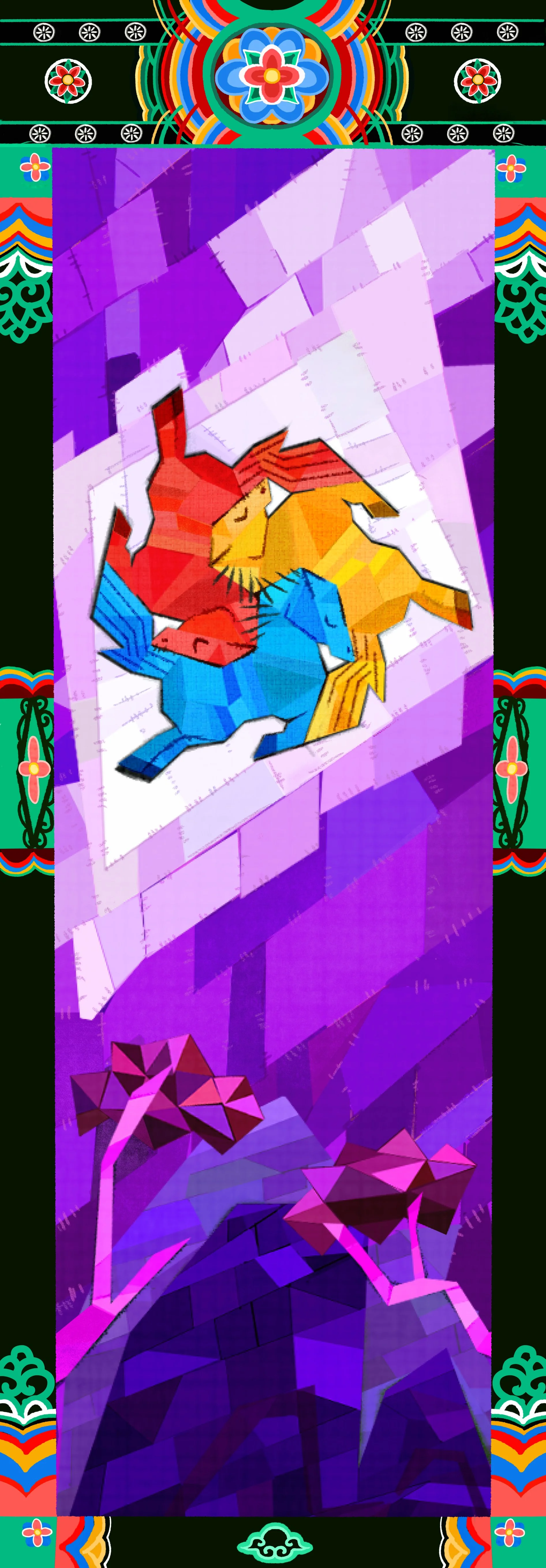 Designing a complete pattern of tessellated horses that would cover the whole plane was much difficult than expected. Inspired by the ‘Samtageuk’ from a older version of South Korea’s flag, the horses were able to be presented as a tessellating spiral.