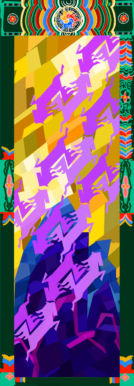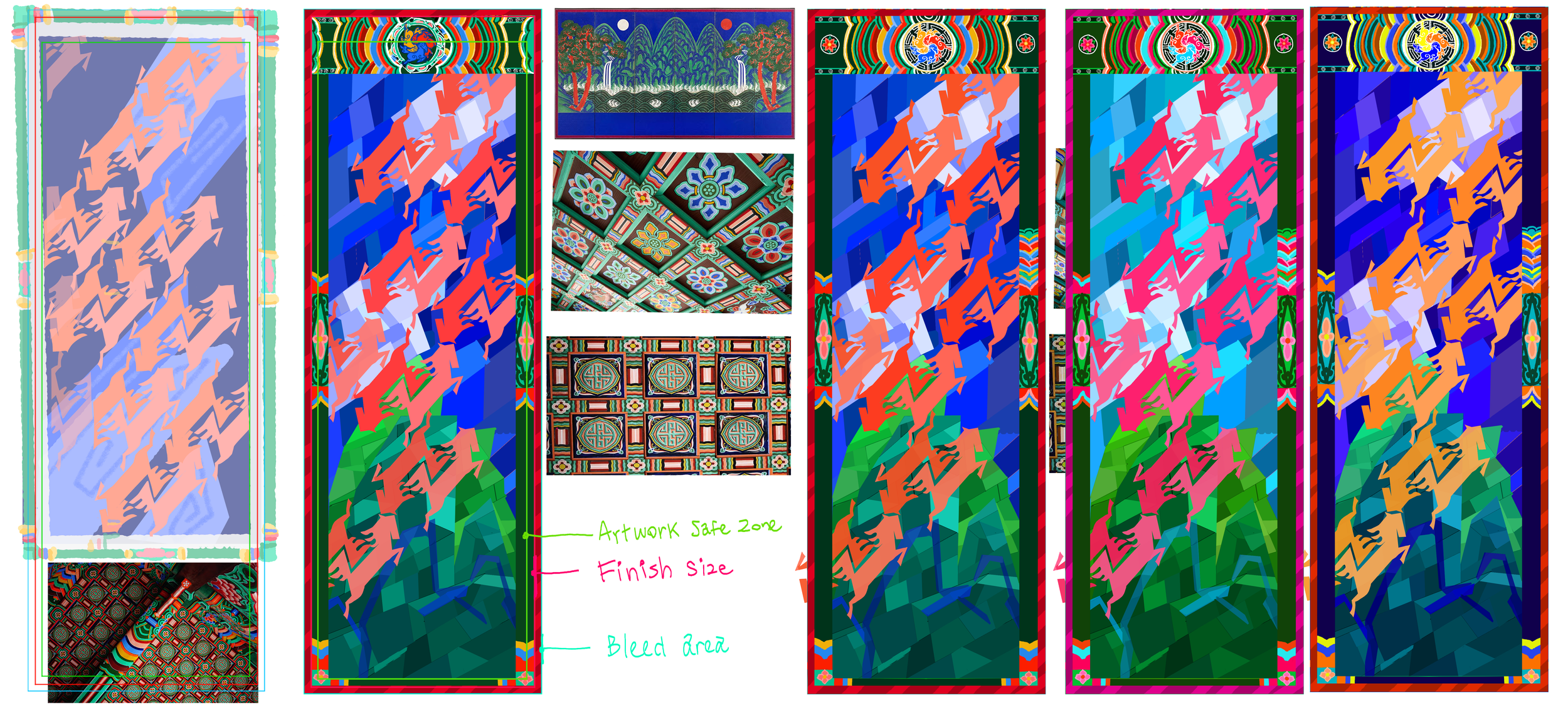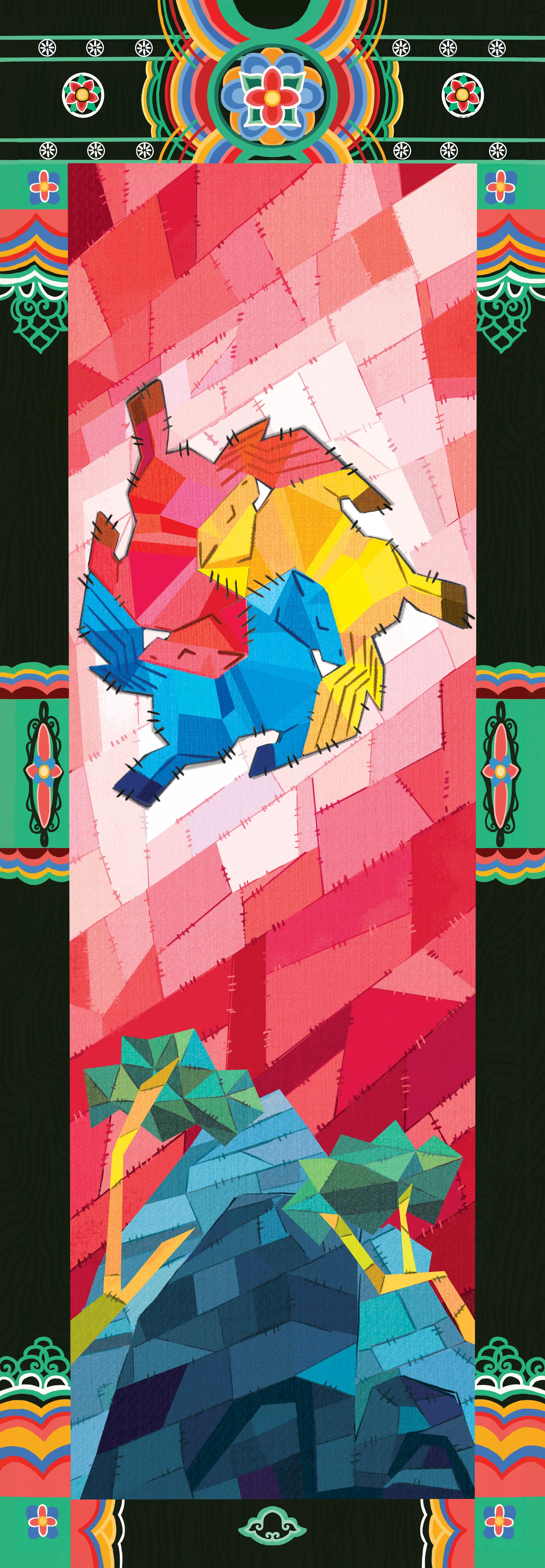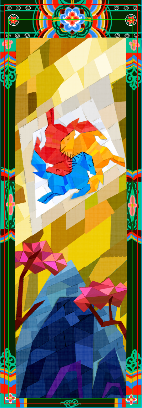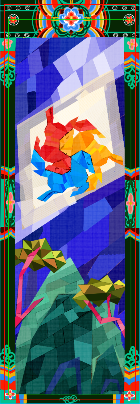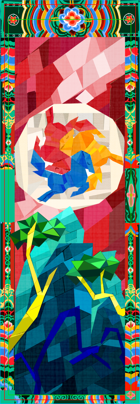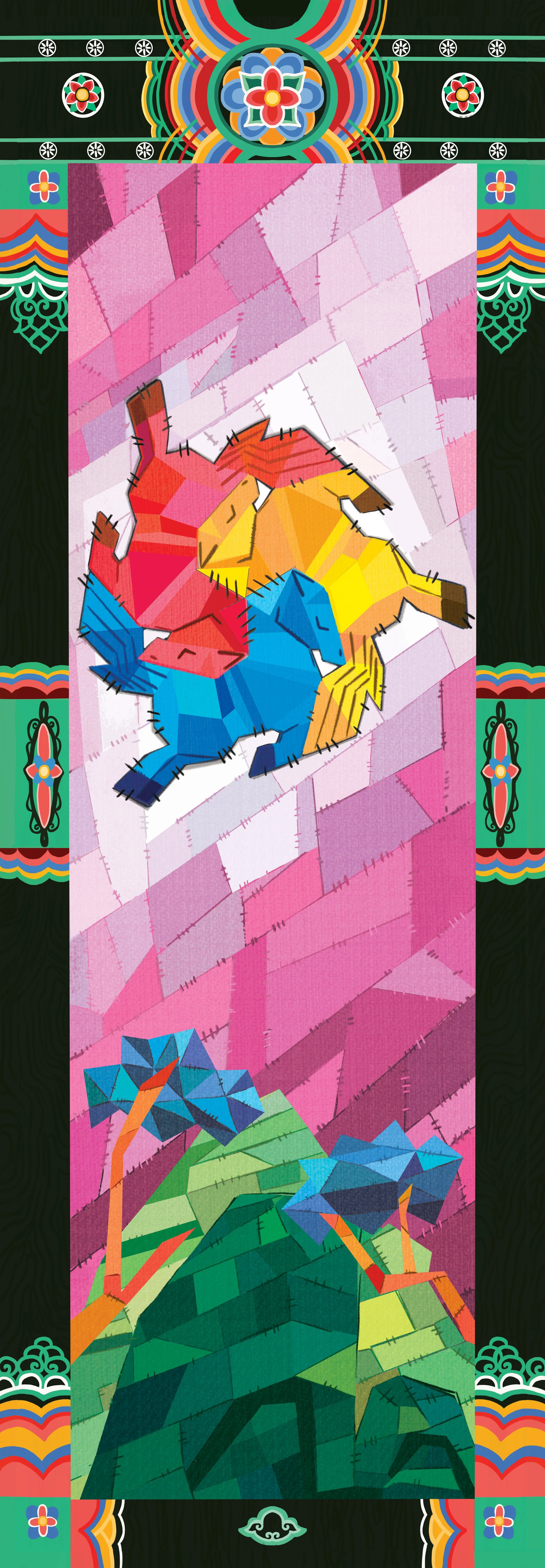 Designing a complete pattern of tessellated horses that would cover the whole plane was much difficult than expected. Inspired by the ‘Samtageuk’ from a older version of South Korea’s flag, the horses were able to be presented as a tessellating spiral.