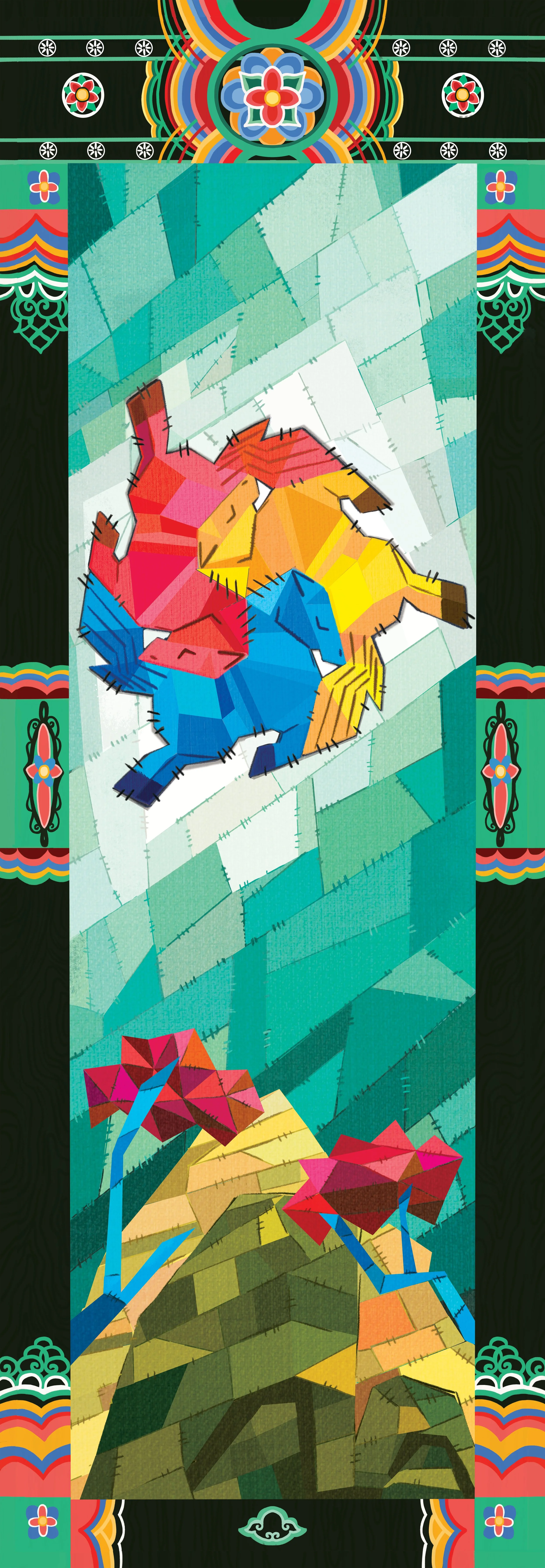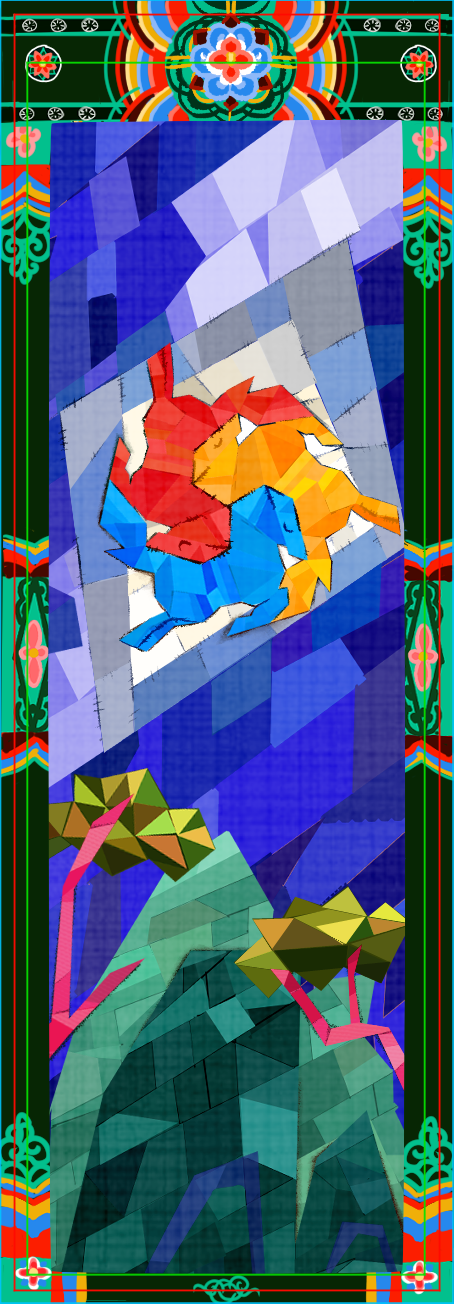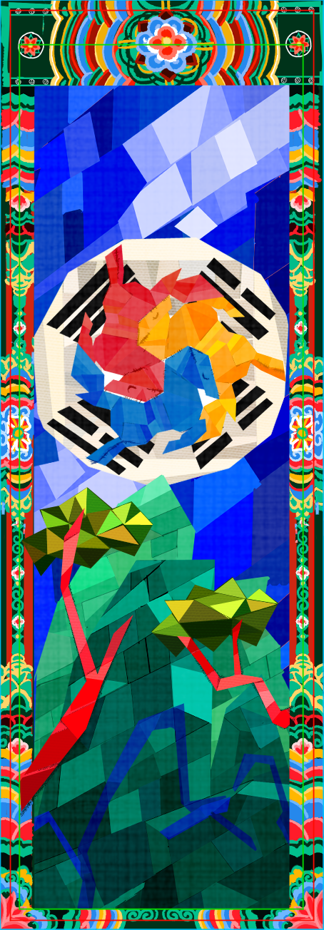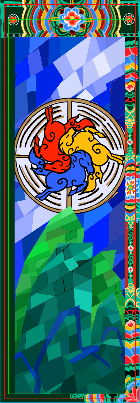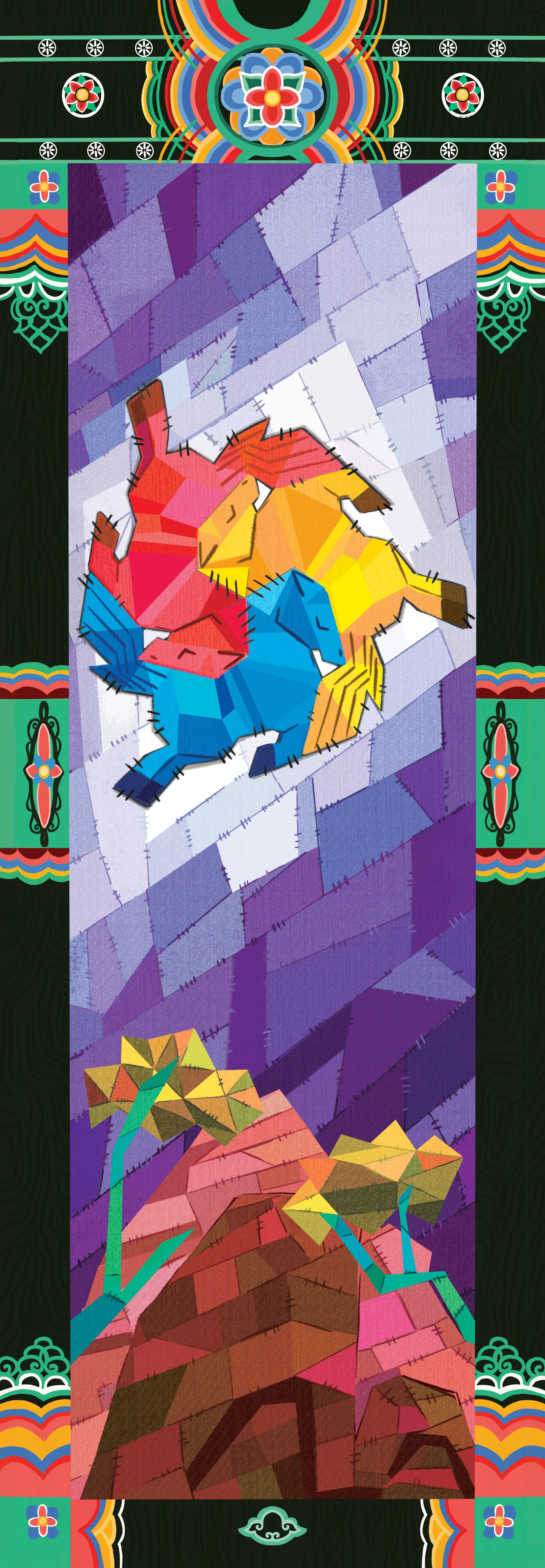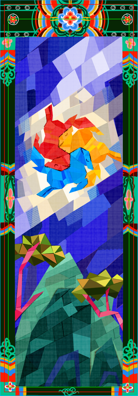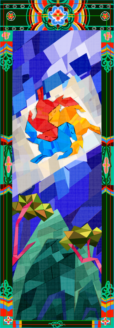 Designing a complete pattern of tessellated horses that would cover the whole plane was much difficult than expected. Inspired by the ‘Samtageuk’ from a older version of South Korea’s flag, the horses were able to be presented as a tessellating spiral.